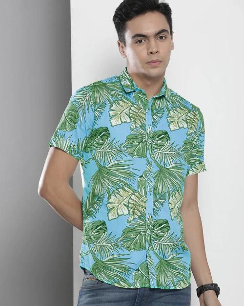 Tropical Print Shirt with Spread Collar