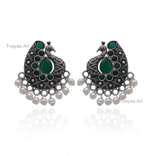 Tvayaa Art Silver Oxidized Stud Earrings Peacock Design Stone Jewellery