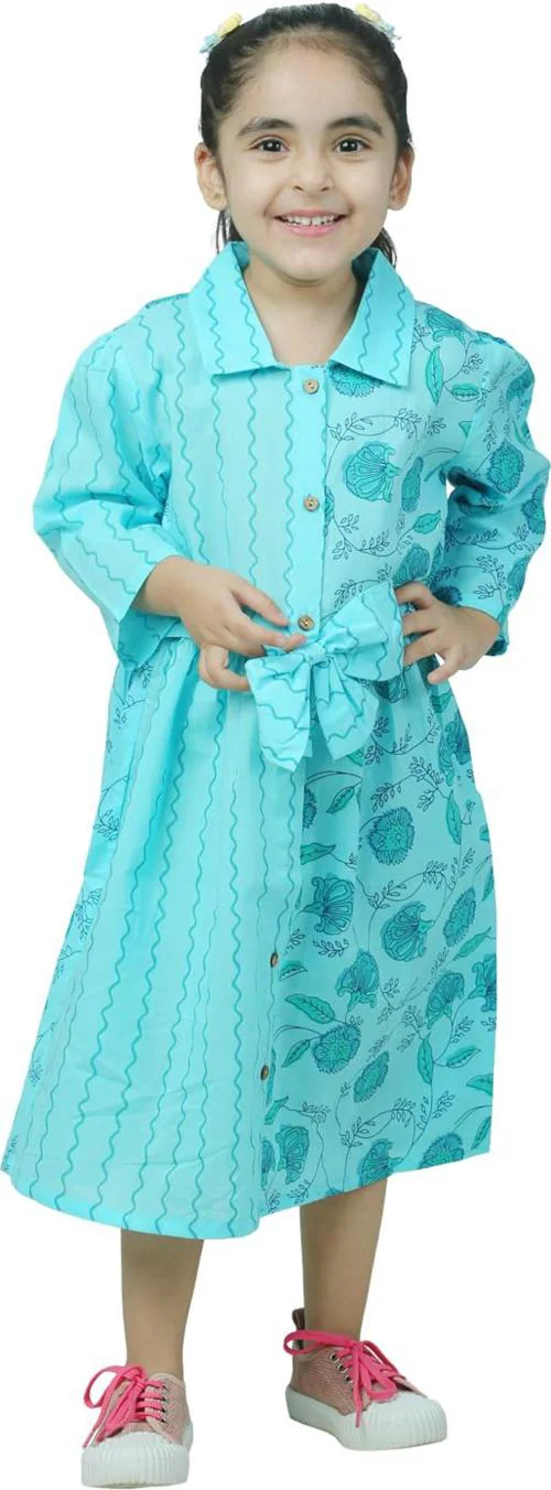 Unbind Girls Light Blue Cotton Cute Casual Printed Dress Frocks