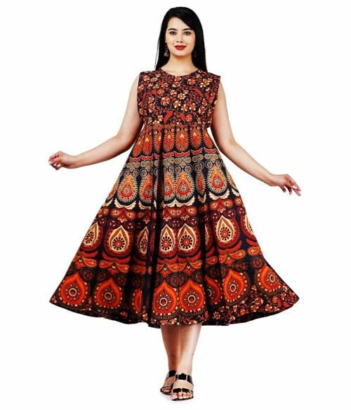 Rangun Women Maxi Cotton Brown Color Printed Dress