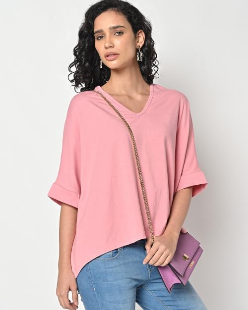V-neck Knitted Top with High-Low Hemline
