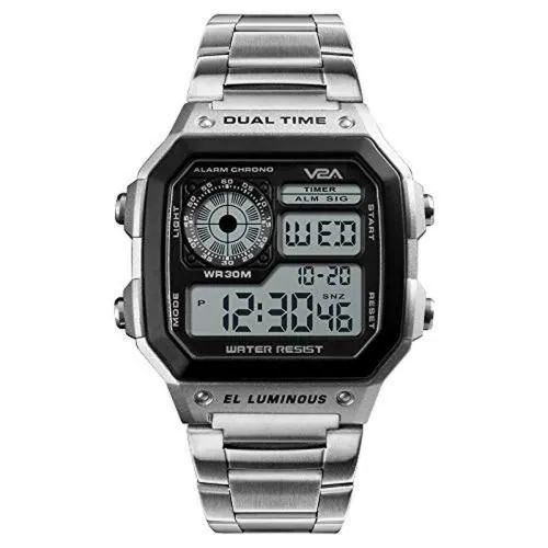 V2A Chronograph Stainless Steel Unisex Mulitifunction Digital Watch (Silver)
