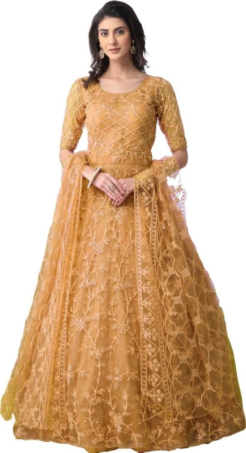 Vaani Creation Women Beige Net Anarkali Gown Dress - Free Size