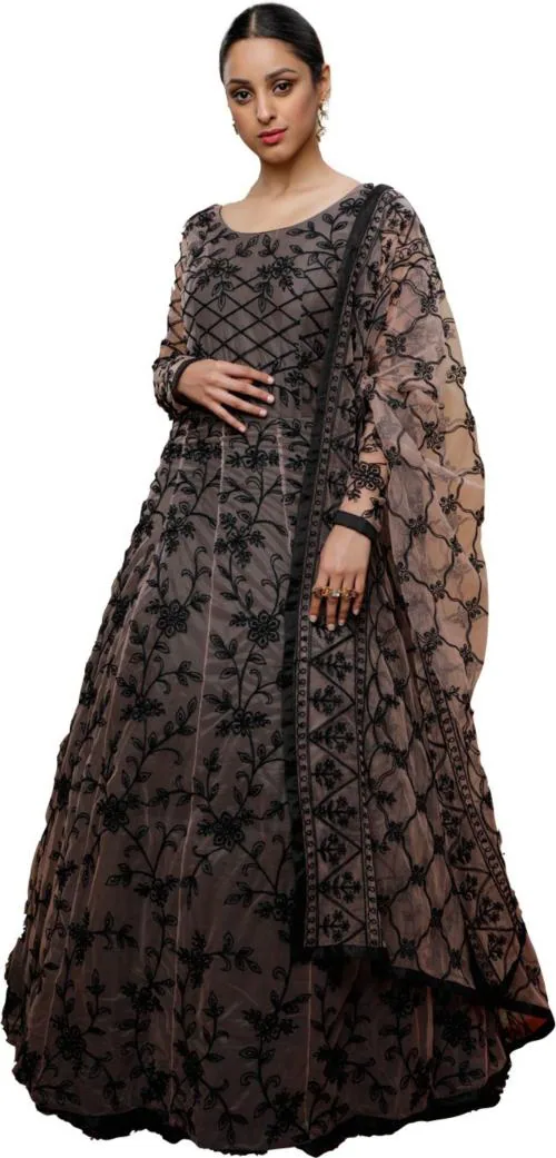 Vaani Creation Women Black and Beige Embroidered Net Anarkali Gown Dress - Free Size
