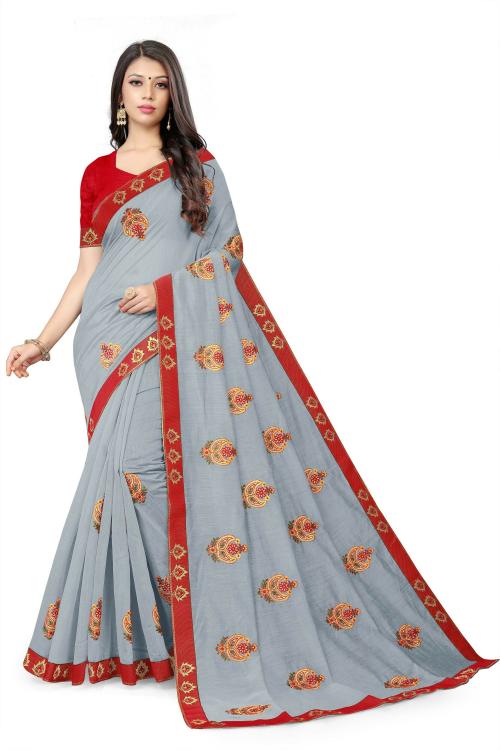 Vajiba Women Grey Embroidered Cotton Blend Wedding Chanderi Saree, Unstitched Blouse Piece