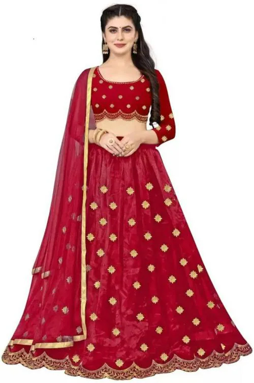 Vajiba Women Red Embroidered Net Wedding Semi Stitched Lehenga Choli With Unstitched Blouse Piece