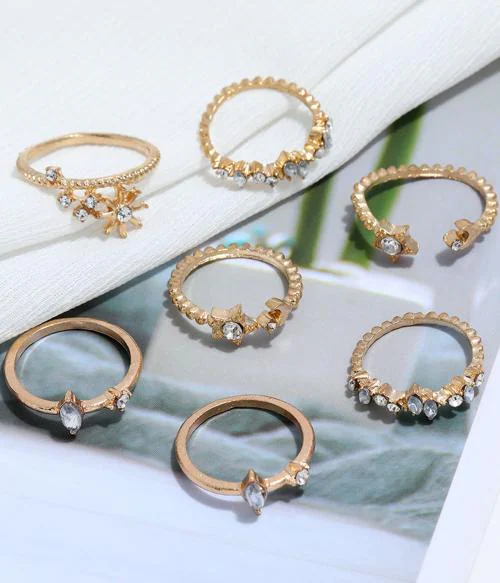 Vembley Gold Plated Seven Piece White Crystal Multi Designs Ring Set