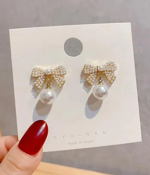 Vembley Korean Bow Tie White Pearl Stud Earrings For Women And Girls