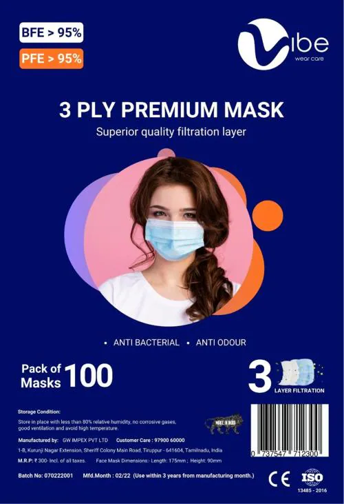 VIBE Unisex Premium 3 Layer Protective Mask(Pack of 100)