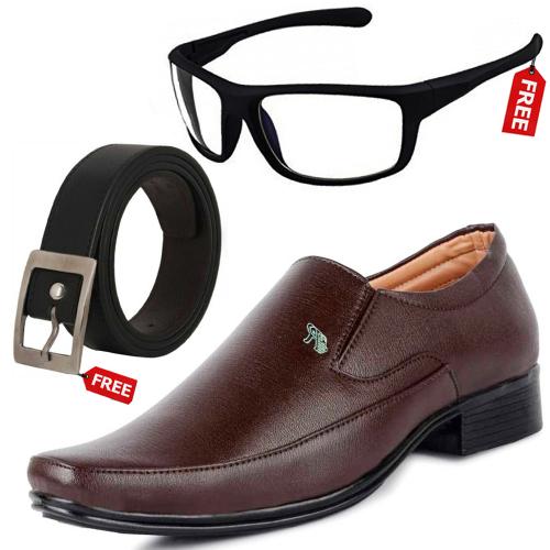 Vitoria Trendy Men's Brown Slip-On Sythetic Leather Formal Shoes With Free Belt & Unisex Sunglasses-9