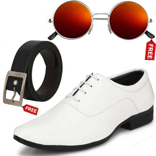Vitoria Trendy Men's White Lace-Up Sythetic Leather Formal Shoes With Free Belt & Unisex Sunglasses-6