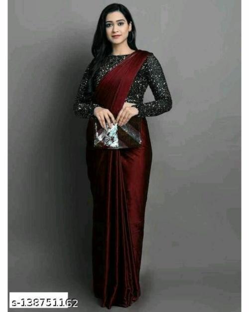 Vkaran Women's Maroon Japan Satin Plain Saree With Blouse