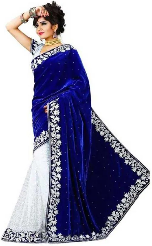 VM TEJANI Women Blue Embroidered Velvet Bollywood Saree