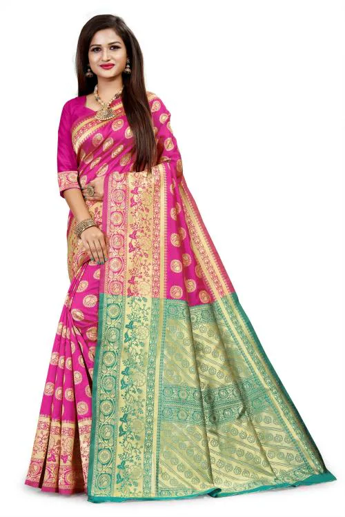 VM TEJANI Women Multicolor Woven Silk Blend, Jacquard Kanjivaram Saree