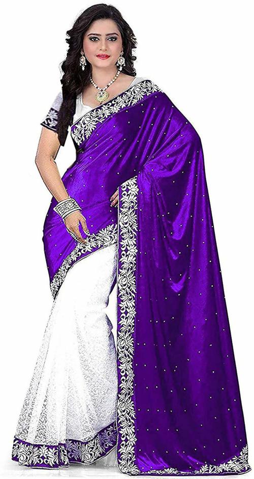 VM TEJANI Women Purple Embroidered Velvet, Brasso Bollywood Saree