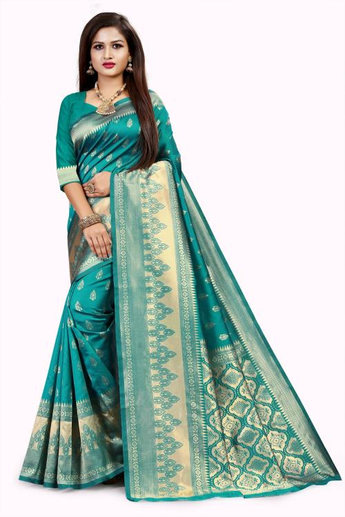 VM TEJANI Women Rama Blue Woven Silk Blend, Jacquard Dharmavaram Saree