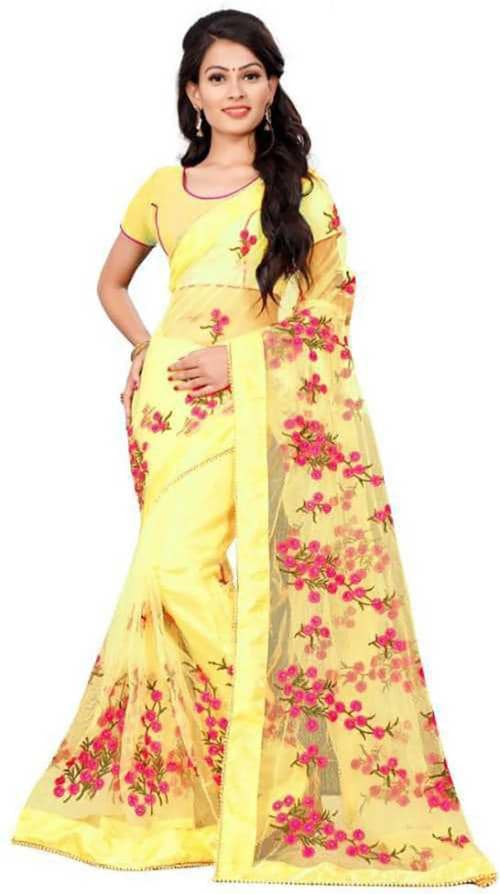 VM TEJANI Women Yellow Embroidered Net Bollywood Saree
