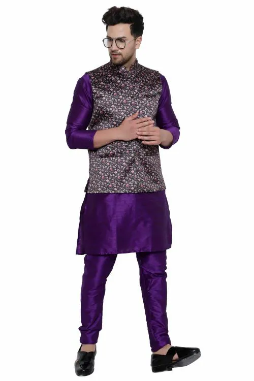 VOLRIX Men's Silk kurta Pajama, Ethnic Printed Jacket Set