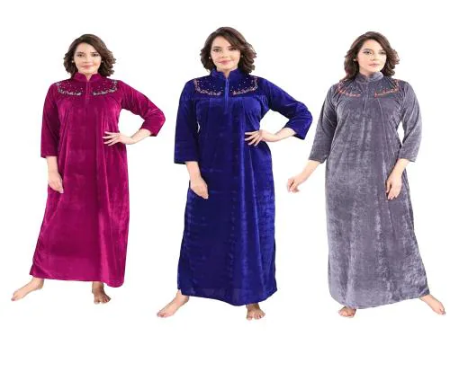 Women's Combo Velvet Nighty Full Length For Winter Wear Nightdress Long Velvet Nighty (Pack of 3) (Navy Blue, Wine, Grey)