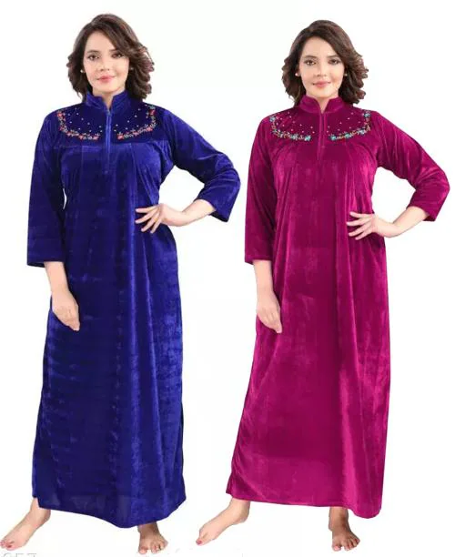 Women's Wool Floral Maxi Nighty For Winter Velvet Woolen Nighty Pack of 2 (Navy Blue, Wine)