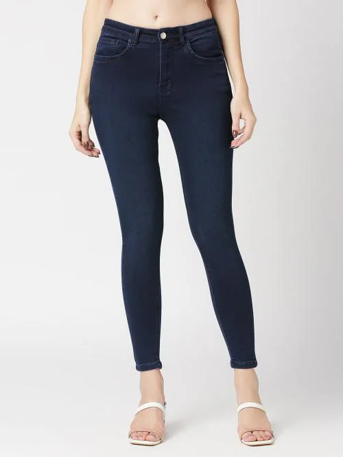 Women Skinny Mid Waist Full Length Dark Blue Jeans