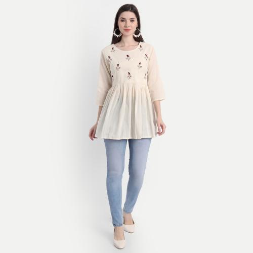 YOELLA Women Hand Work Round Neck Flored Tunic (Beige)