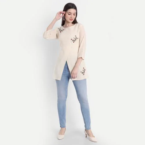 YOELLA Women Hand Work Round Neck Flored Tunic (Beige)