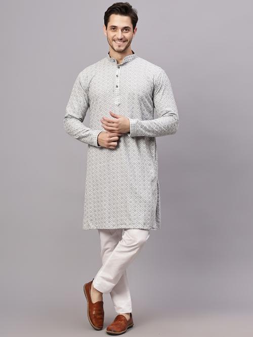 Yugnik Men's Pista Chikankari Florist Sequined Long Kurta Set