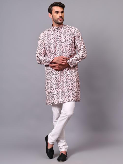 Yugnik Men's Pista Self Leaf Printed Crochet Fabric Long Kurta Set