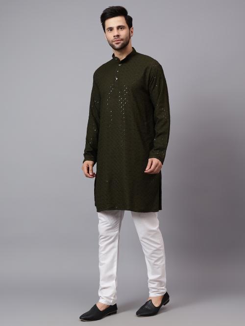 This Red kurta and white pajama set is adorned with a triangle pattern and sequin work, showcasing intricate Chikankari embroidery. Perfect for weddings or cultural events, style this set with mojaris and a sleek bracelet for an elegant look.Product Details:Gender: MenPattern: Triangle PatternDesign Type: Chikankari Sequin WorkAvailable Colors: Red, Black, Green, Magenta, Navy Blue, YellowClosure: ButtonFabric: Rayon Schiffli SequenceCollar: Mandarin Collar/Chinese CollarProduct Length: LongHemline: CurvedSleeves Length: Full SleevePack of: 1Items Included: Kurta, PyjamaMaterial & Care: Rayon Schiffli Sequence, Dry Clean OnlyHow to Style: For a sophisticated and polished look, pair this Red Chikankari Kurta set with traditional mojaris and a sleek bracelet. Add a classic watch and a subtle chain to elevate your style. This ensemble is perfect for weddings or cultural events, ensuring you stand out effortlessly.Style Tip:Footwear: Traditional mojarisAccessories: Sleek bracelet and a classic watchAdditional: Subtle chain for a complete lookShop Now: Enhance your wardrobe with the elegant Yugnik Men's Red Chikankari Tringle Pattern Embroidered Sequined Long Kurta Set, a perfect blend of tradition and style.