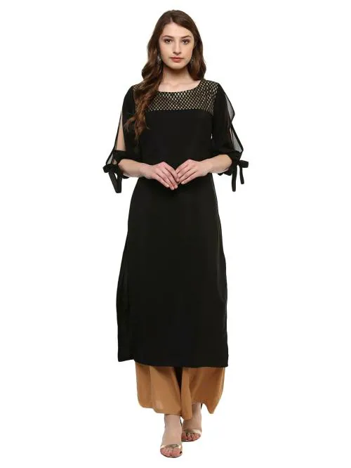 Flaunt Sartorial Elegance When You Wear This Black Coloured Kurta By Ziyaa. Look Classy And Stylish In This Piece And Revel In The Comfort Of The Soft Crepe Fabric. Team It With Contrasting Churidar And Kolhapuris To Complete Your Look For The Day.