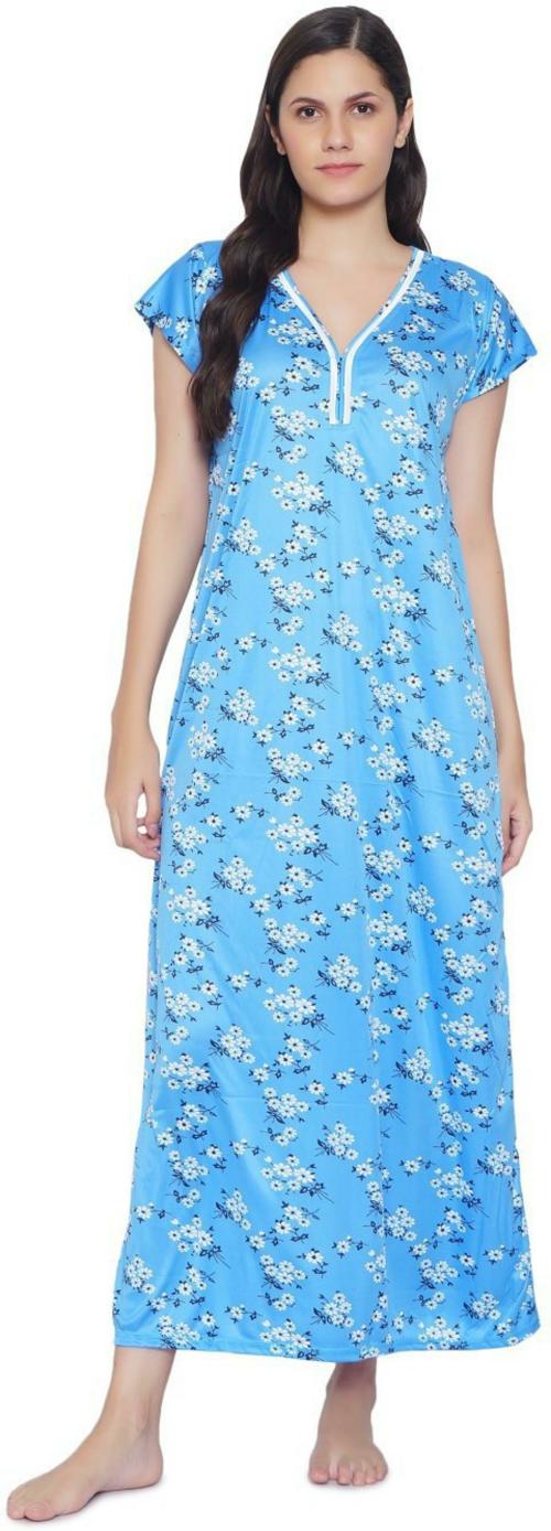 Zionity Women Blue Floral Satin Nighty