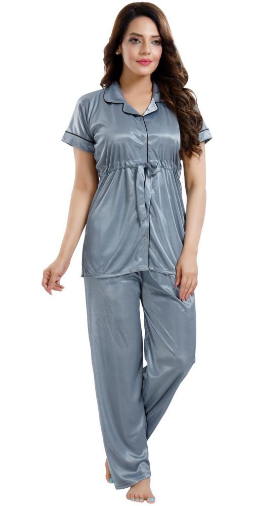 Zionity Women Grey Solid Satin Nightsuit Set (XXL)