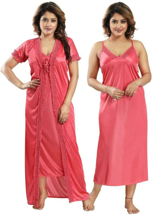 Zionity Women Pink Solid Satin Pack of 2 Nighty