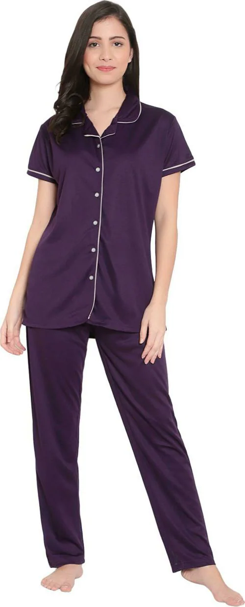 Zionity Women Purple Solid Satin Nightsuit Set (L)