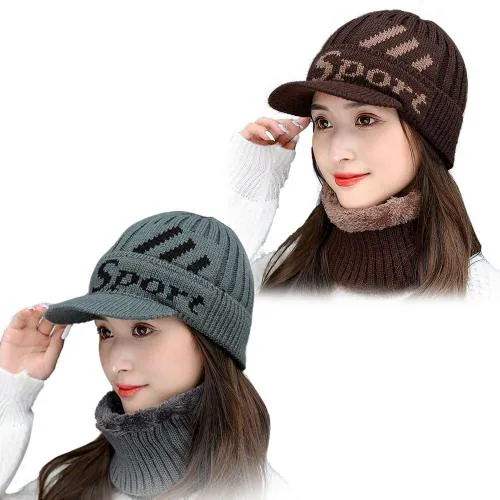 ZURU BUNCH Pack of 2 Woolen Winter Cap for Women with Neck Muffler, Hat Women Plus Fluffy Beanie Cap Letter Cap Two-Piece Knitted Hat Warn Soft for Snow, Home, Outdoor (Brown & Grey)