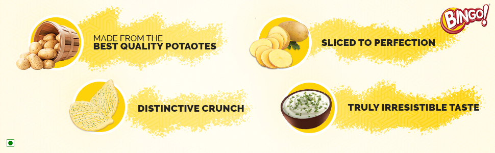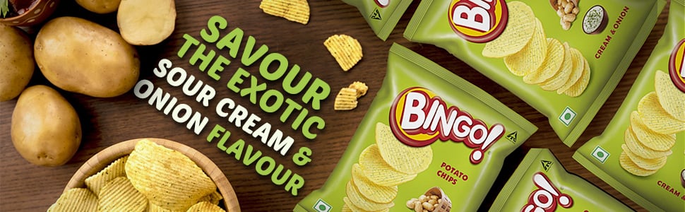 - BINGO! POTATO CHIPS: Go on an adventure filled with the flavours of pure cream, delicious cheese, and fresh spring onions