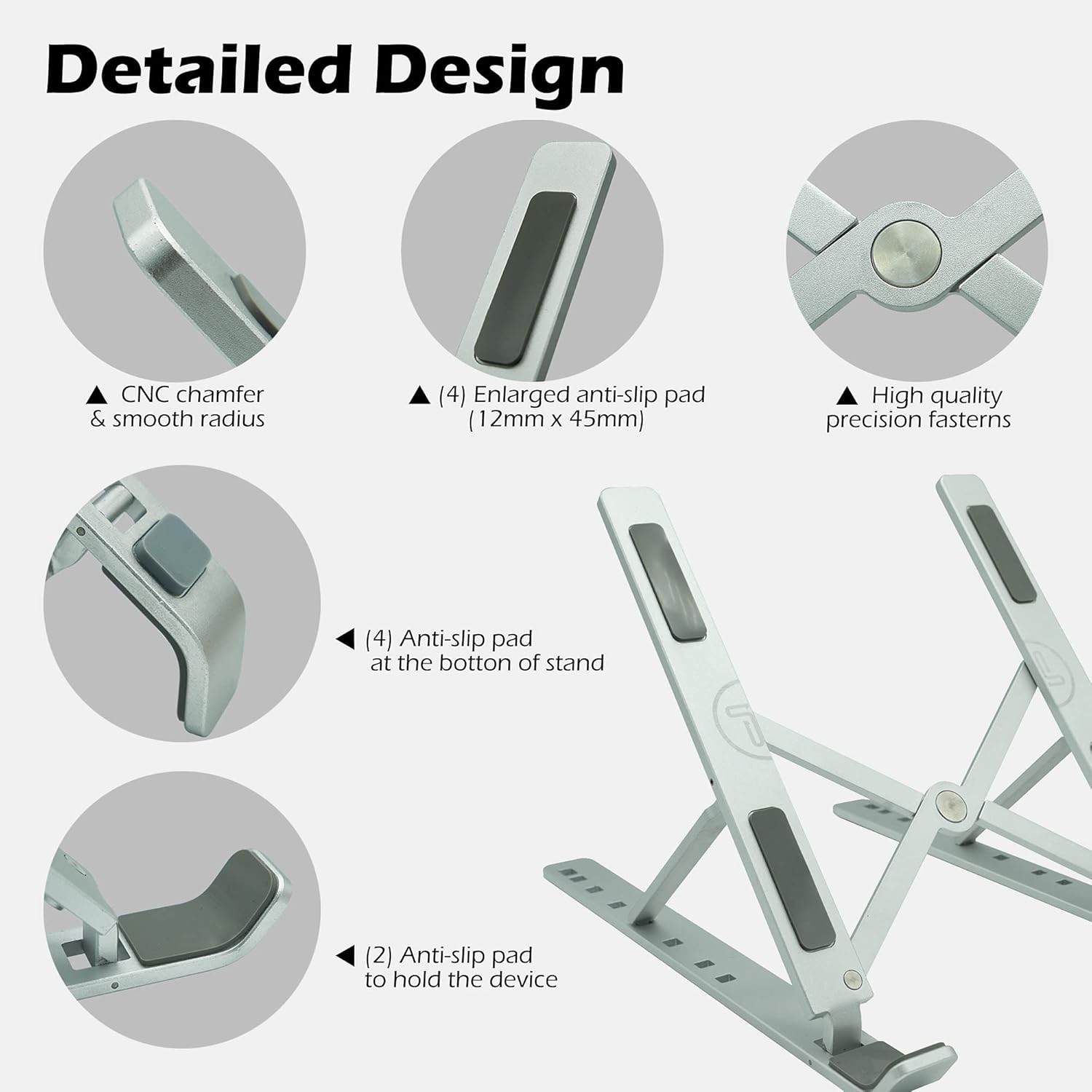 - The classic screw fixation ensures that the compurter stand is more stable and firm.Non-slip silicone pads are on the top and bottom to safeguard your desk and laptop against scratches and slippery
