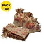 LifeKrafts Purple Floral Drawstring Jute Linen Gift Pouches 20 cm x 17.5 cm ( Pack of 100)