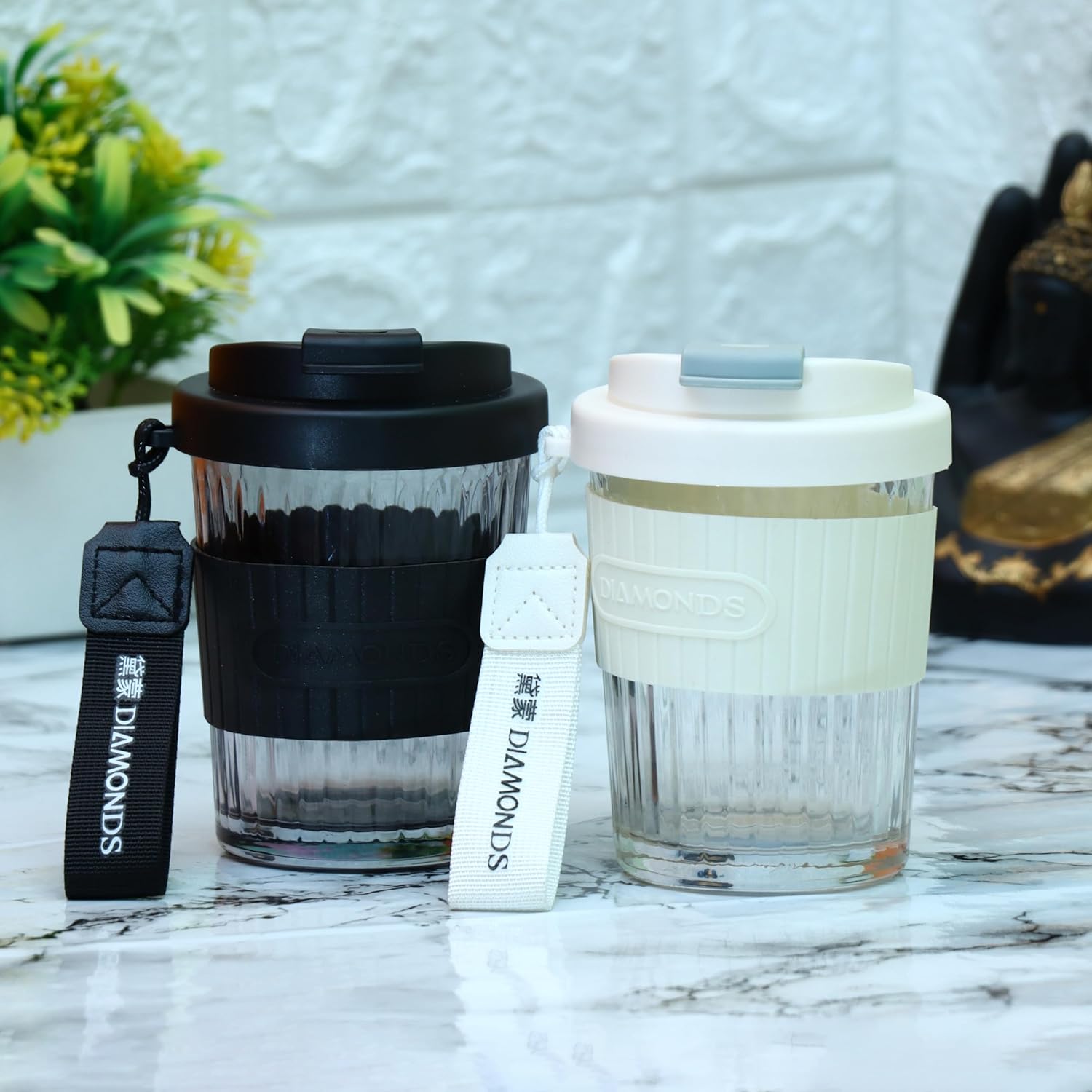 Nimika Sipper Glass Diamond Black Strip Home Office Drinking Water Cup portable coffee glass tumbler 500 ML 1 PCS