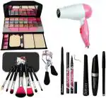 Plethora BLACK Smudge Proof Kajal,3in1 Combo set,36h Eyeliner,Curler,Set of 7 BLACK/PINK Makeup Brushes,All in One Best Makeup kit 6155 (Eyeshadow,Blusher,Compact,Lip Gloss) & Foldable Hair Dryer