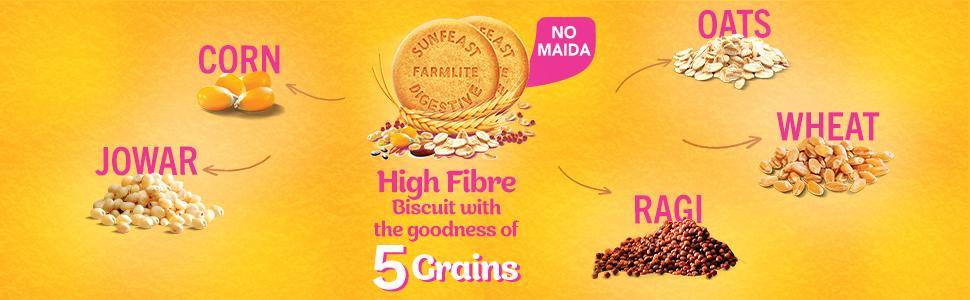 - HIGH FIBRE MULTIGRAIN: Sunfeast Farmlite 5 Grain Digestive biscuit is a high fibre multigrain biscuit that’s made for today’s multitaskers