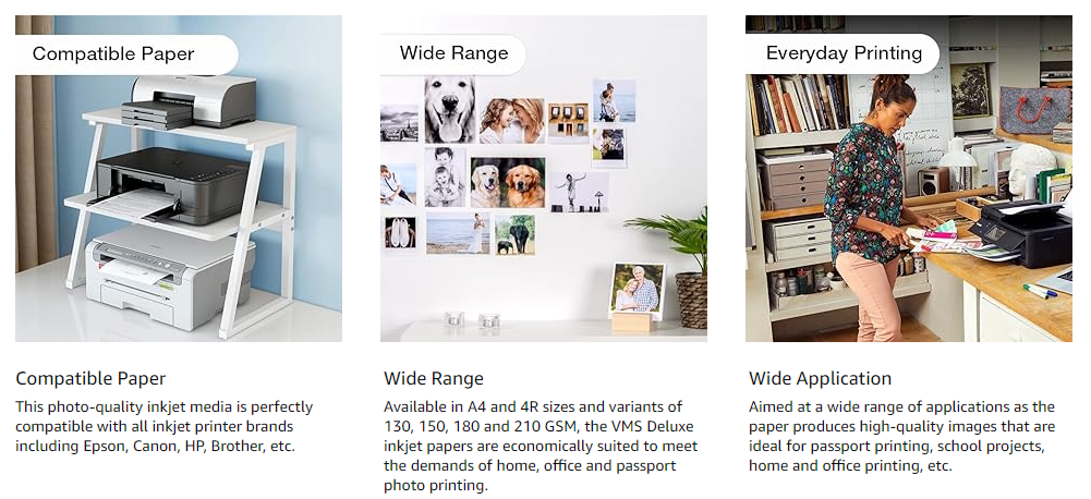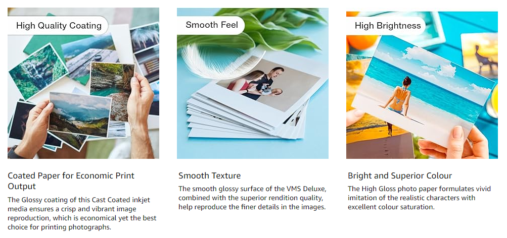 - Creative Media: VMS deluxe photo paper is suitable for printing modes of 1440dpi up to 5700dpi, thus allowing a user to produce the best soft finish photographs like scrapbooks, photo walls, artwork and much more.