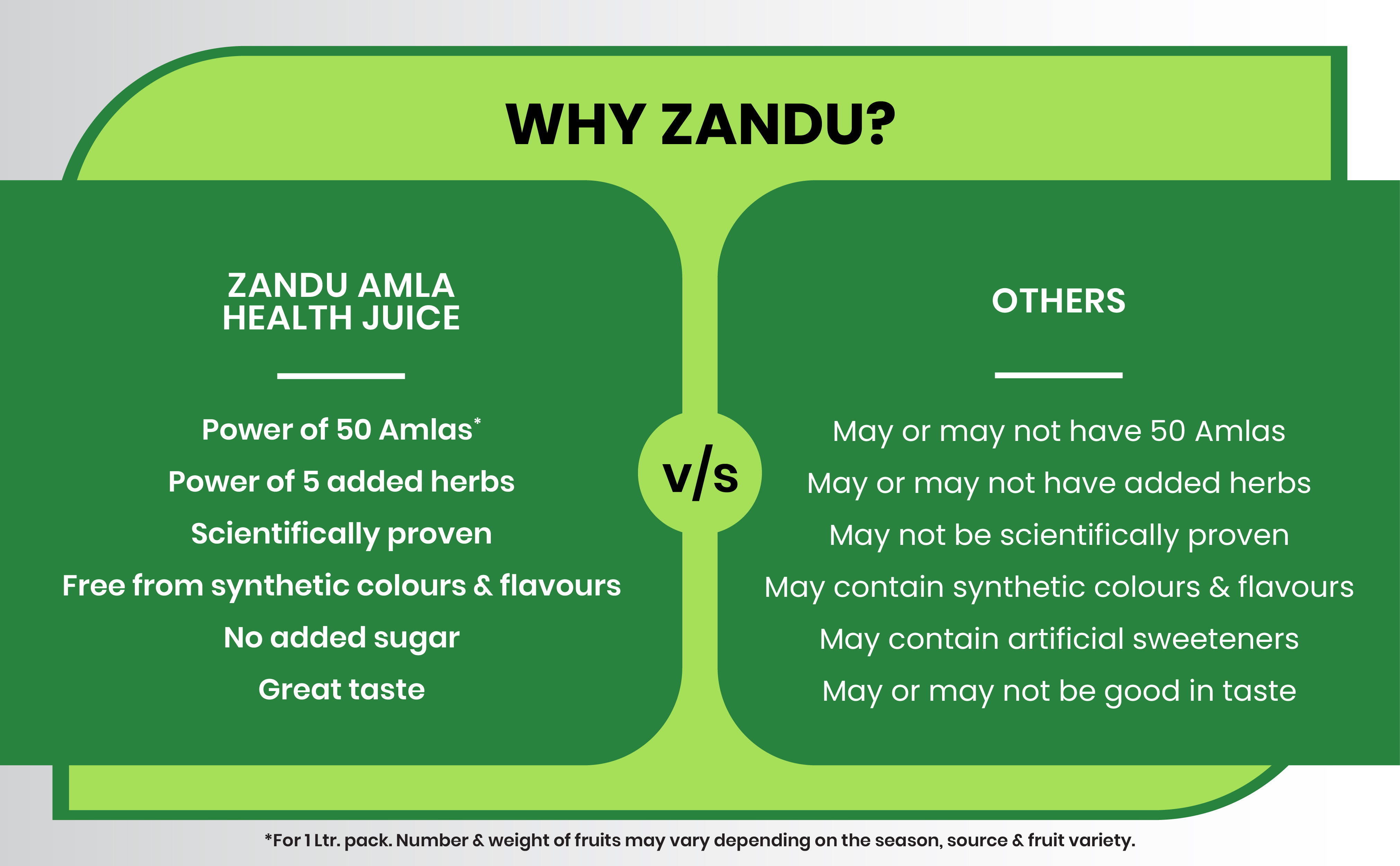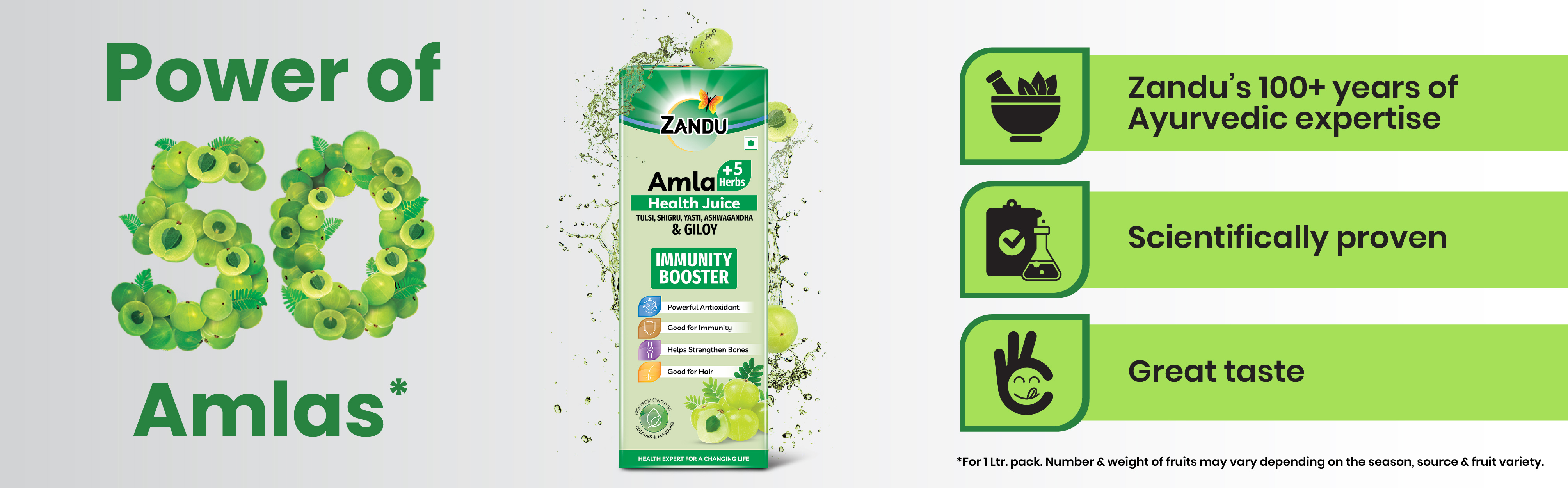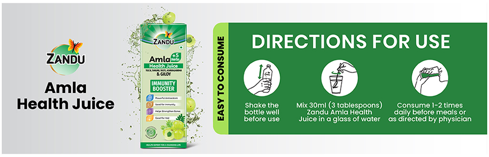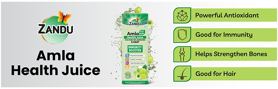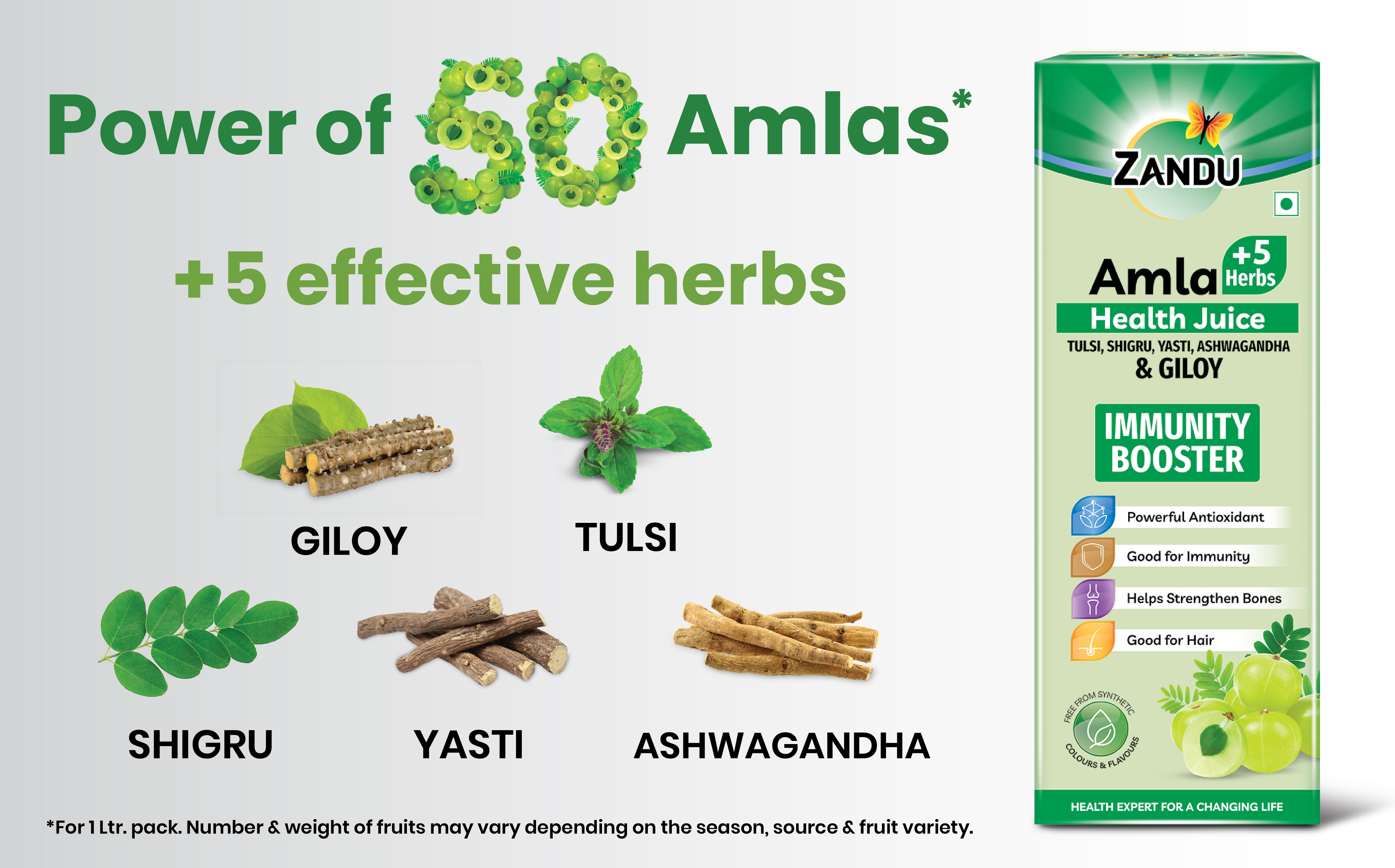 - Along with Amla, the juice contains Giloy - a natural immunity booster, Tulsi - has anti bacterial, anti viral and anti fungal properties, Shigru - has anti inflammatory properties, Yashti - helps in better digestion and respiratory health and Aswagandha