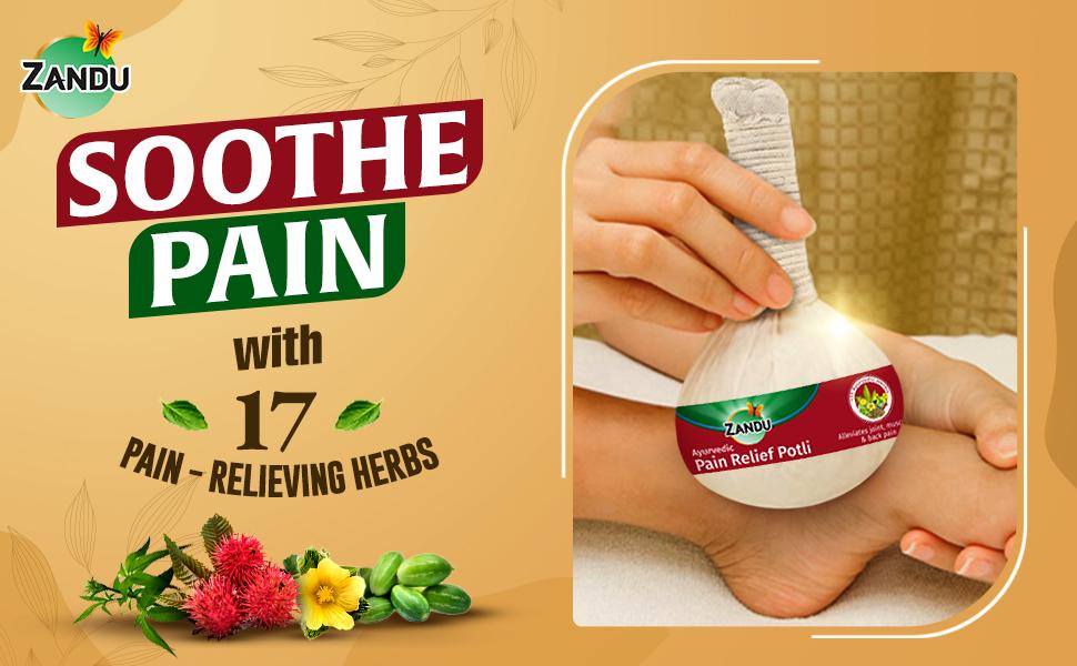 - Zandu’s Ayurvedic Pain Relief Potli helps reduce swelling, stiffness, and inflammation while improving blood circulation and relieving discomfort. Zandu pain relief potli is made from 100% natural and Ayurvedic ingredients, free from chemicals.