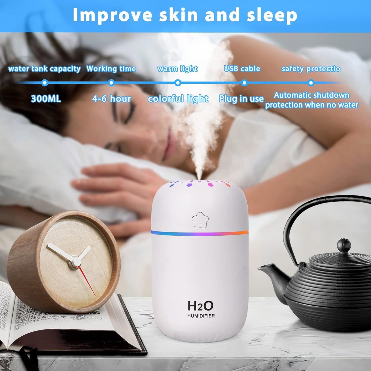 - 300ML small humidifiers produce a near-silent frequency 30dB ensuring ultra-quiet operation. This humidifier won’t bother you while sleeping and working. This small air humidifier can soften and moisten dry and chapped skin in winter. Use as mister during