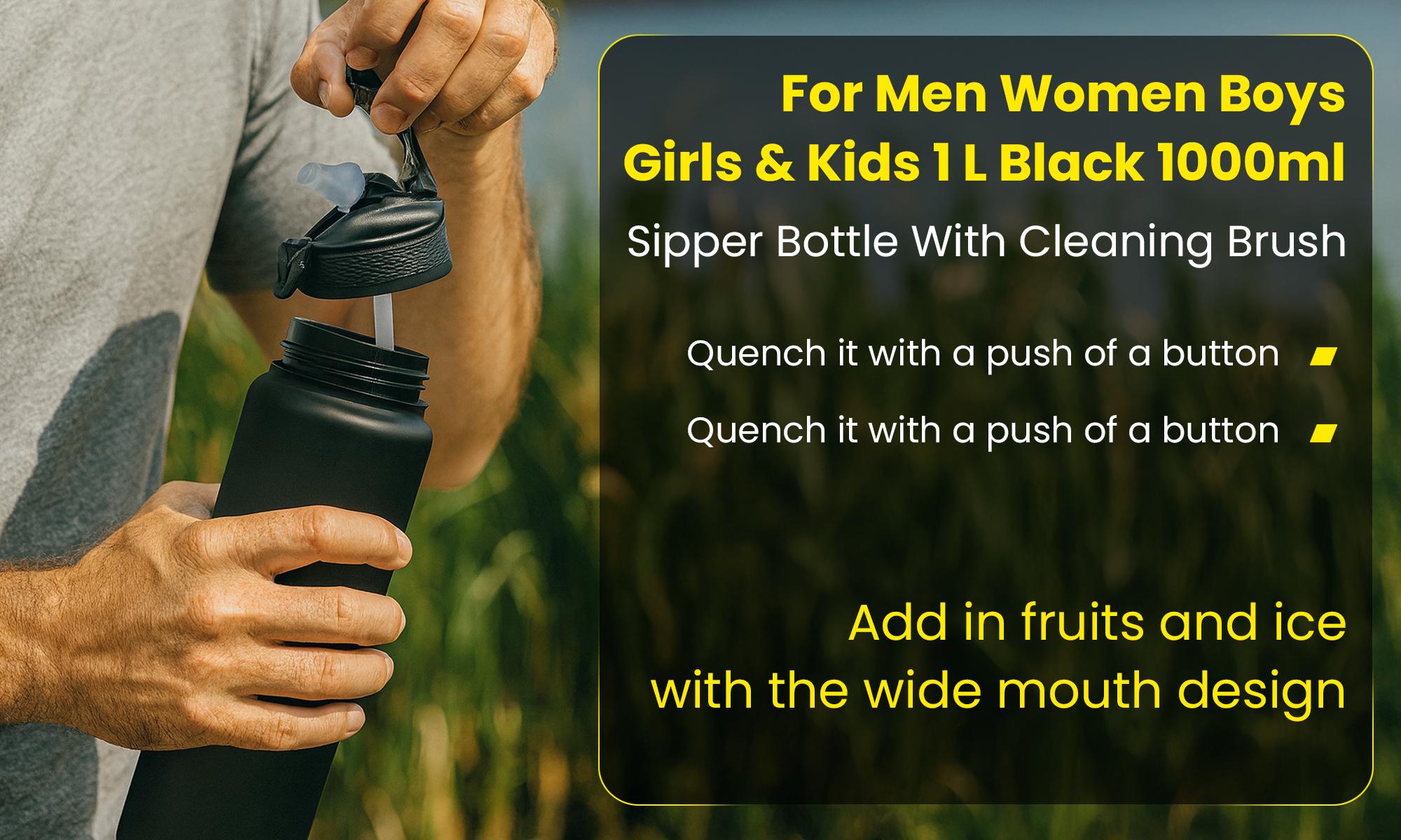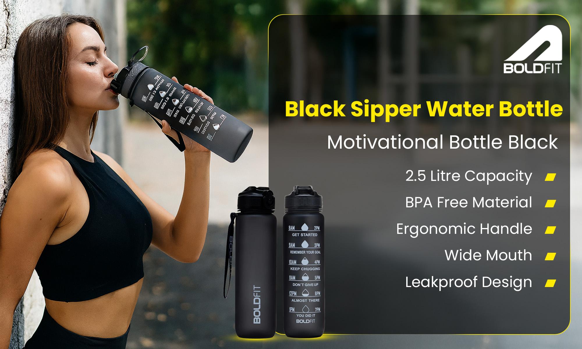 Boldfit Water Bottle For Sports Home Gym Office Motivational Leakproof Water Bottle With Time Marker BPA Free Sipper Bottle With Cleaning Brush For Men Women Boys Girls & Kids 1 Litre Black 1000ml