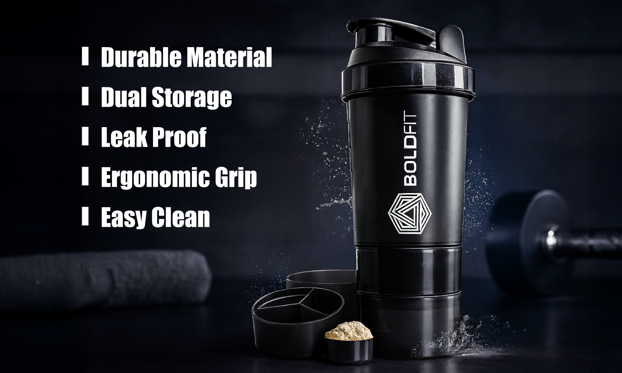 Boldfit Spider Gym Shaker Bottle, Shakers for Protein Shake with 2 Storage Compartment Gym protein shaker for workout (High Density Polyethylene, Pack of 1, Black)