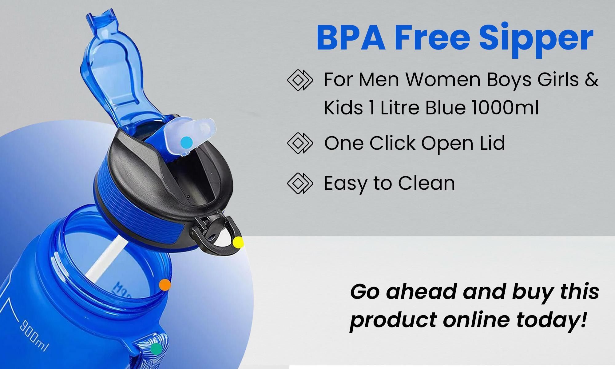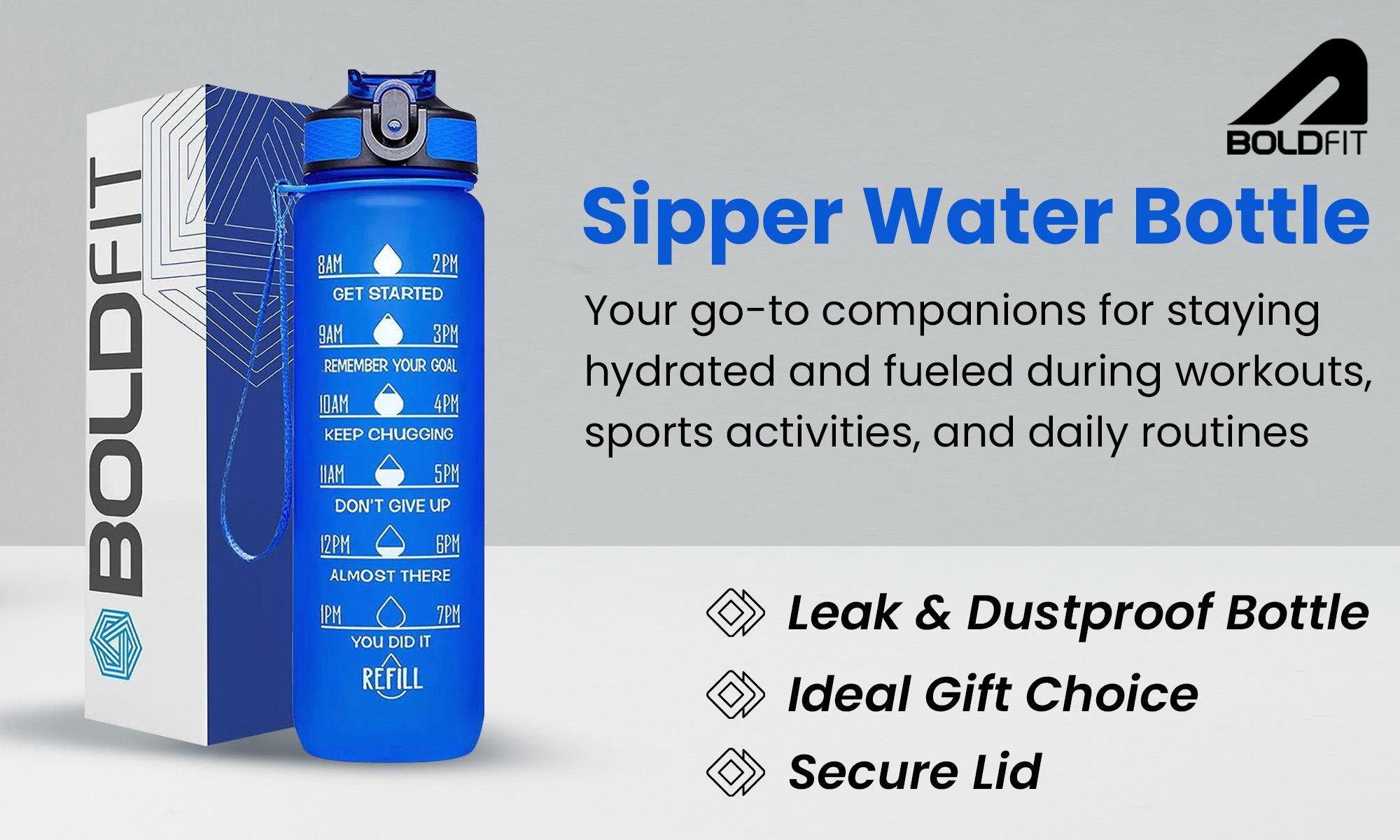 Boldfit Water Bottle For Sports Home Gym Office Motivational Leakproof Water Bottle With Time Marker BPA Free Sipper Bottle With Cleaning Brush For Men Women Boys Girls & Kids 1 Litre Blue 1000ml