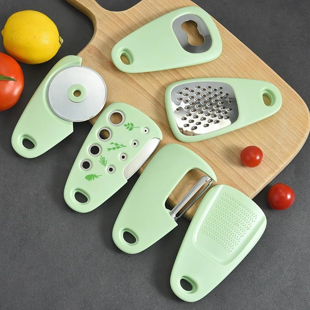 Ceplo Set of 6 Kitchen Tools, Stainless Steel Accessories Mini Vegetable Peeler Space-Saving Cheese Grater, Bottle Opener, Fruit/Vegetable Peeler, Pizza Cutter, Garlic/Ginger Grinder